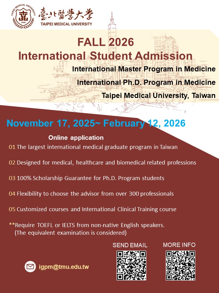 l International Master Program in Medicine & International Ph.D. Program in Medicine (Attached guidelines) : https://medicine-en.tmu.edu.tw/research/departments/international-master-ph-d-program-in-medicine/